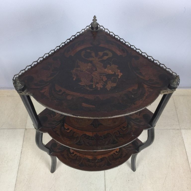 Rinconera estilo Napoleón III, ebanizada. Tres estantes con marqueterie floral. Baranda y aplicaciones en bronce. 78 x 44 x 34 cm.