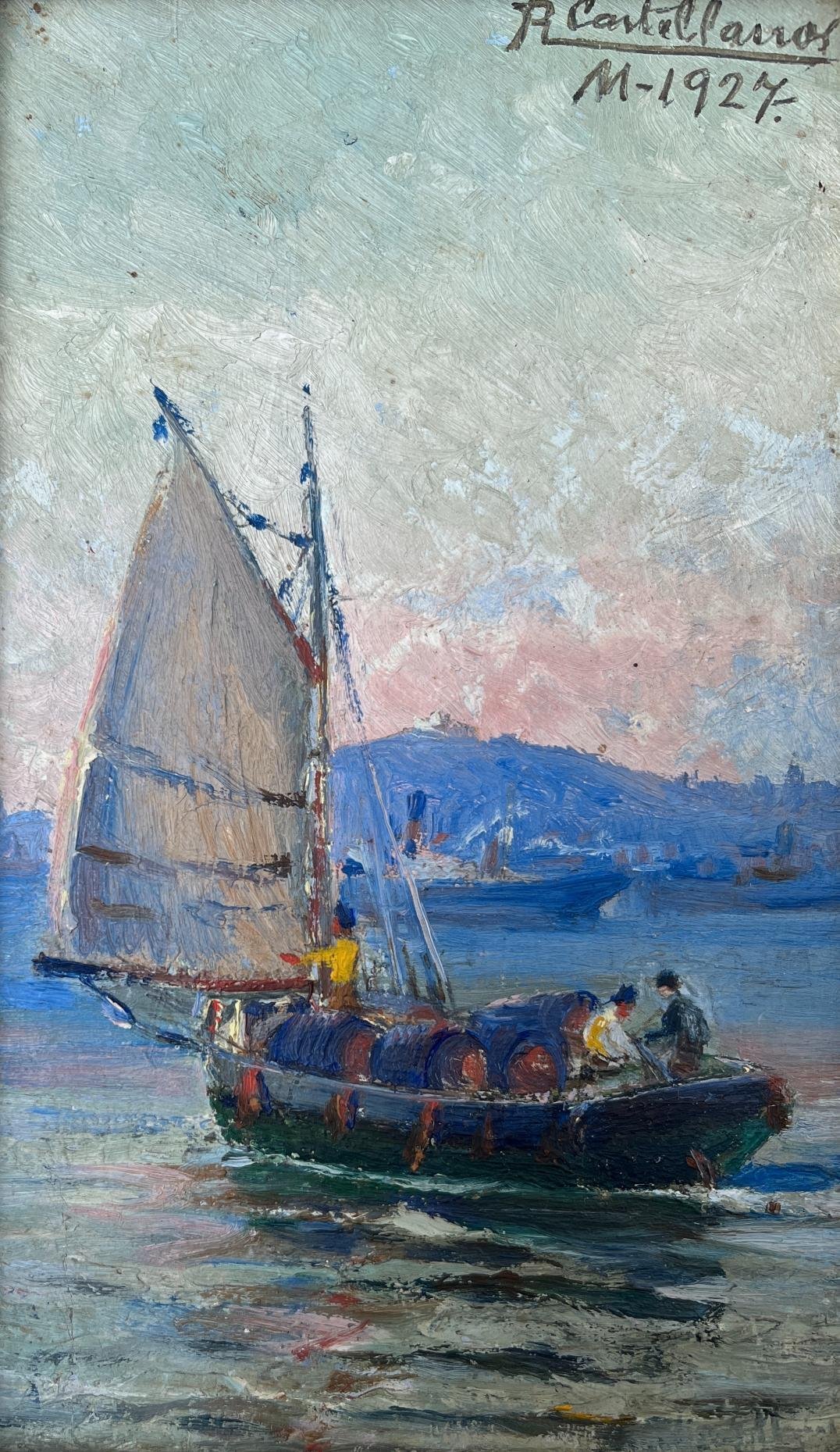 ROBERTO CASTELLANOS (escuela uruguaya, 1871-1942). Óleo sobre tabla. «Bahía y cerro de Montevideo.» Firmado y fechado «1927» arriba a la derecha. 20 x 12 cm.