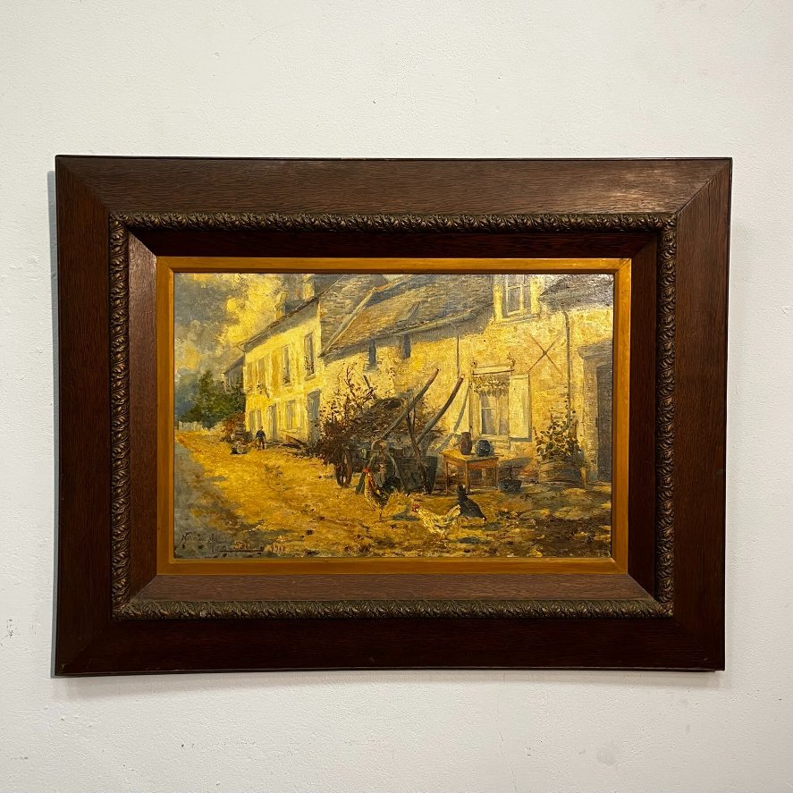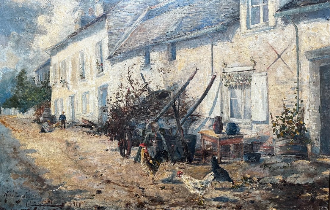 CASTELLANOS, Roberto (escuela uruguaya, 1871-1942). Óleo sobre tela. «Paisaje de Normandía.» Firmado, situado «Normandía» y fechado «1918» abajo a la izquierda. 49 x 73 cm.