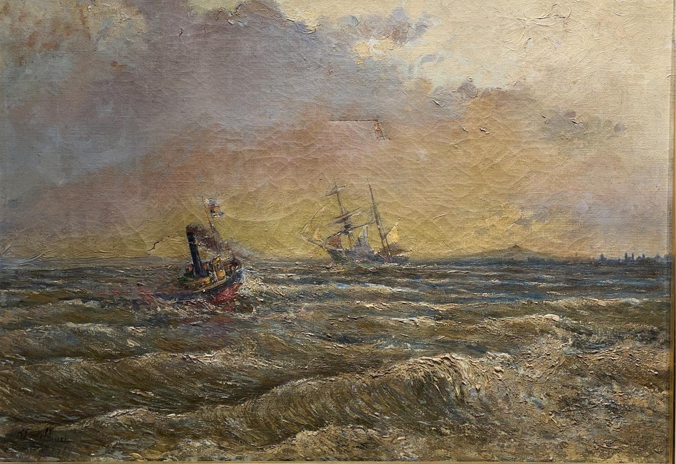 ROBERTO CASTELLANOS (escuela uruguaya, 1871-1942). Óleo sobre tela. «Bahía de Montevideo.» Firmado y fechado «1914» abajo a la izquierda. 50 x 70 cm. Presenta pequeños desprendimientos en óleo.