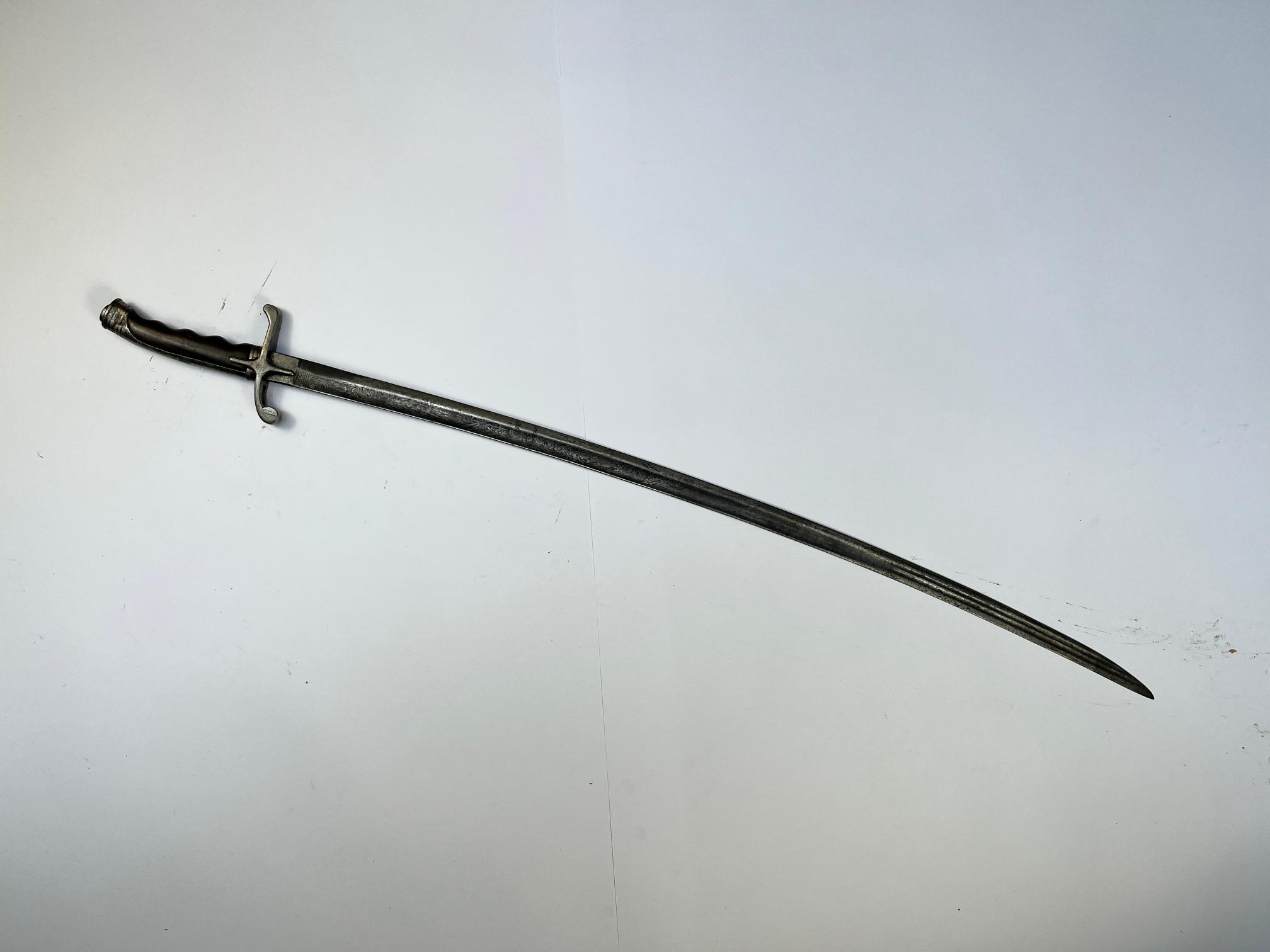 Sable alemán. Hoja tallada al ácido «motivos militares». Empuñadura en madera lisa. Sin vaina. Largo total 87 cm.