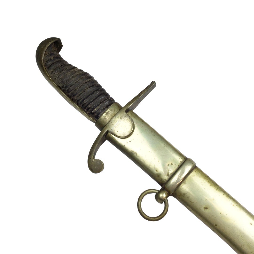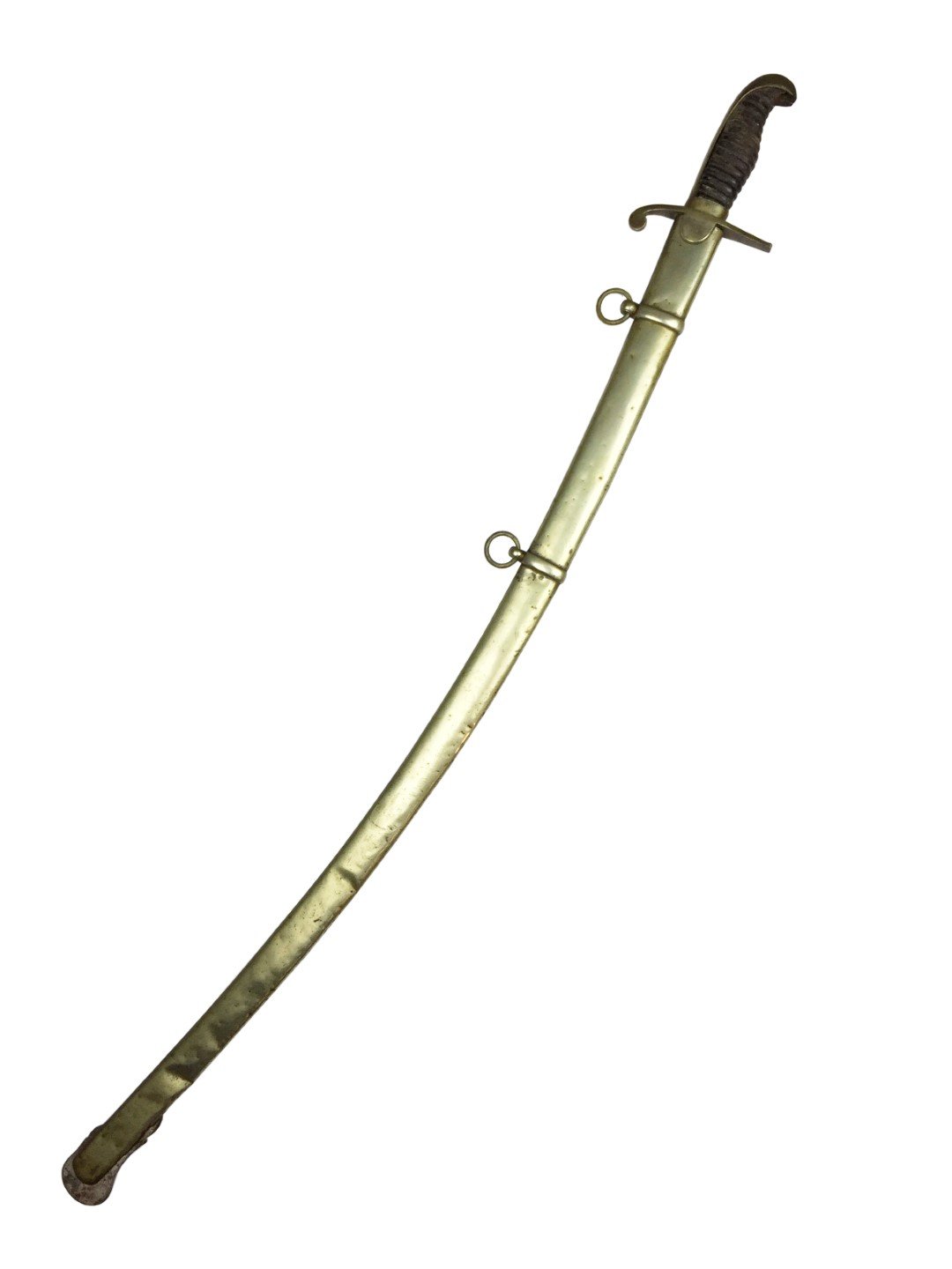 Sable curvo alemán de caballería pesada. Hoja tallada al ácido «arabescos». Empuñadura en madera forrada en cuero, con cubremano y gavilán en alpaca. Falta parte de cubremano. Vaina en alpaca con dos anillas y batiente en hierro forjado. Largo 97 cm.