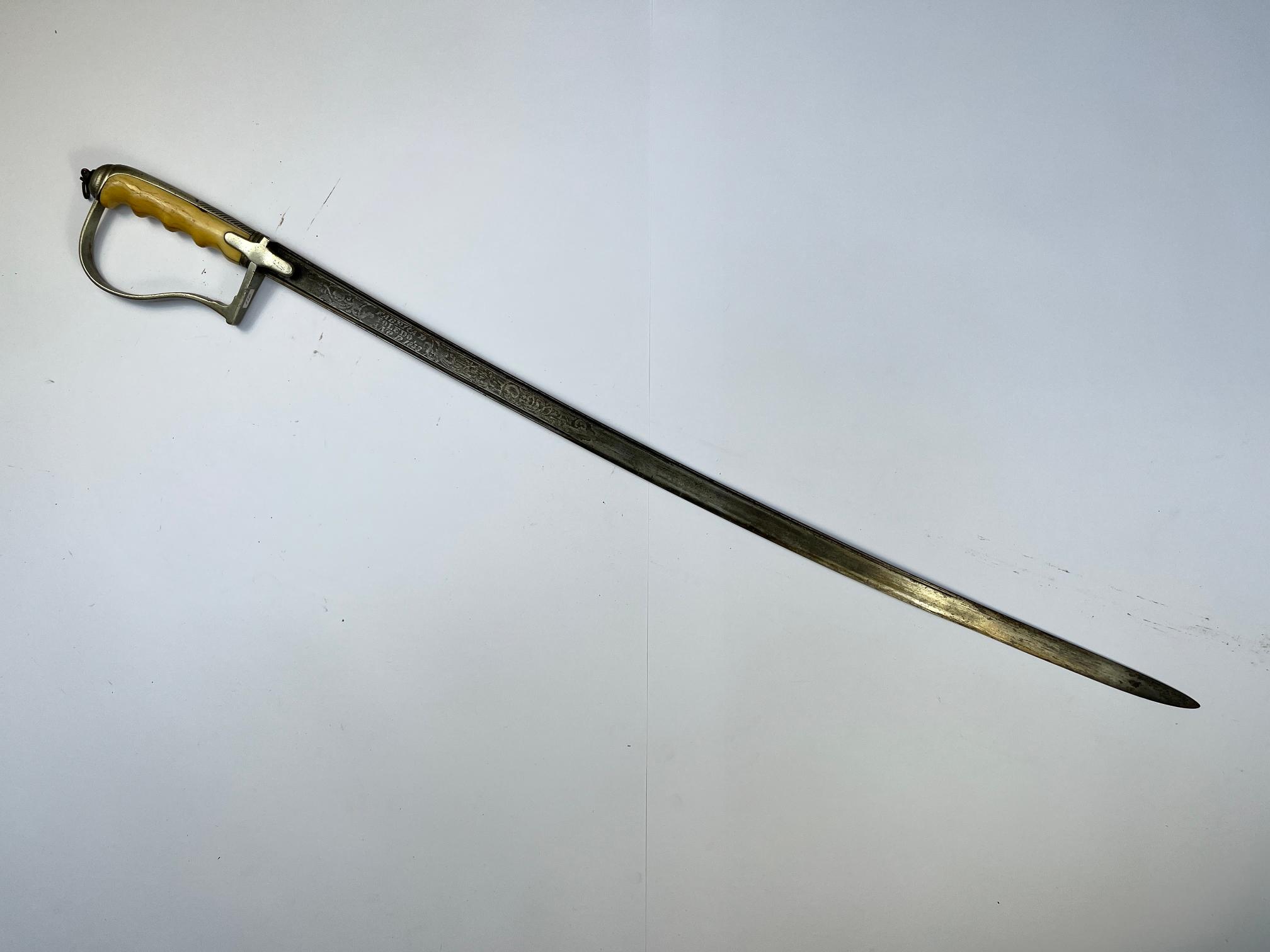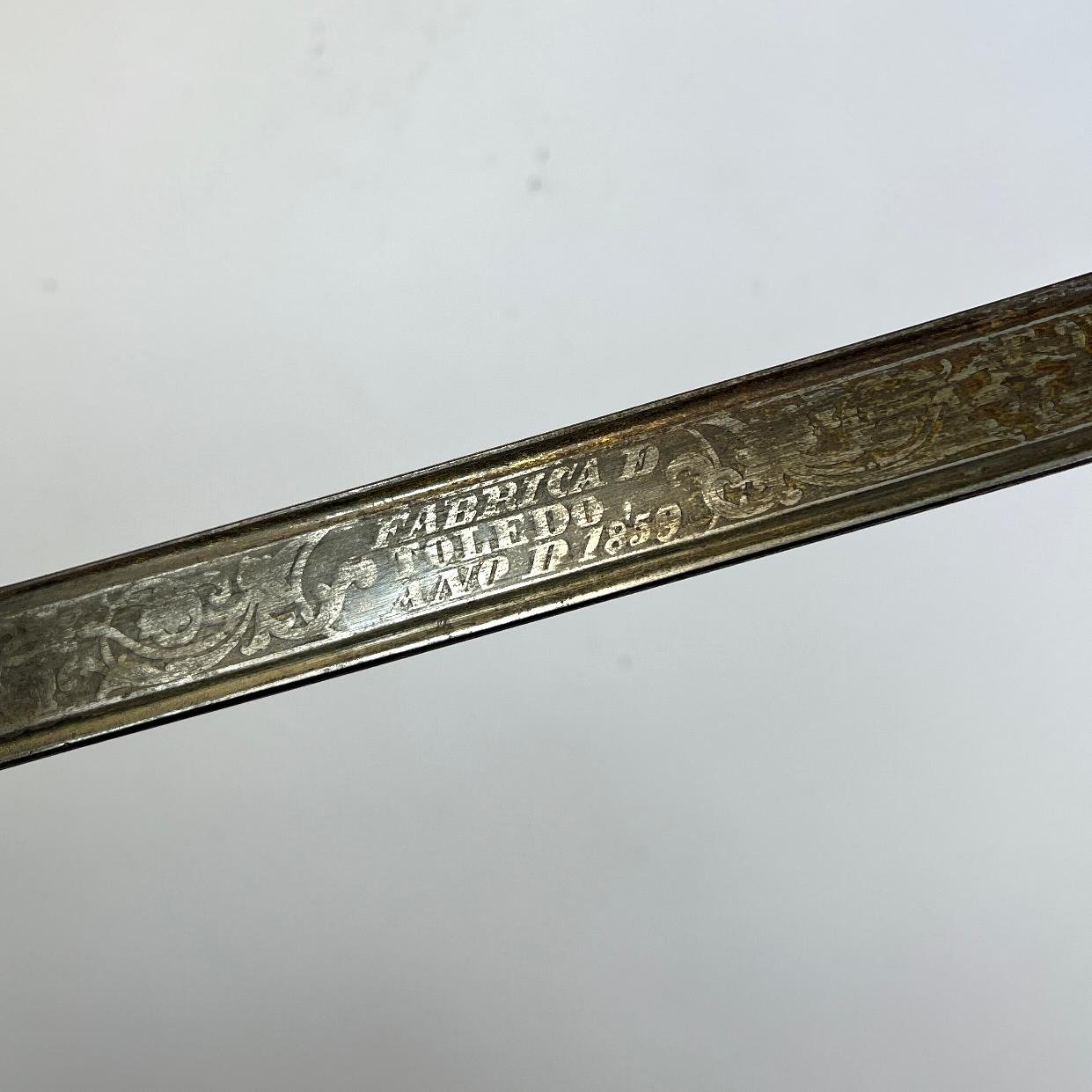 Sable español. Hoja grabada al ácido «arabescos» e inscripción «Fábrica D Toledo año D 1859». Empuñadura en marfil de morsa. Guardamano en alpaca. Sin vaina. Gavilán modificado. Largo total 92 cm.