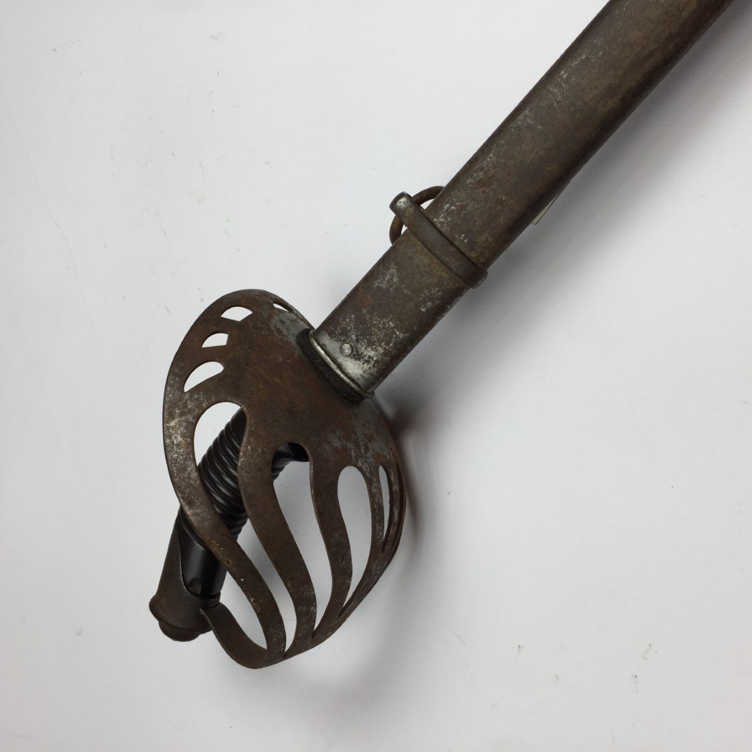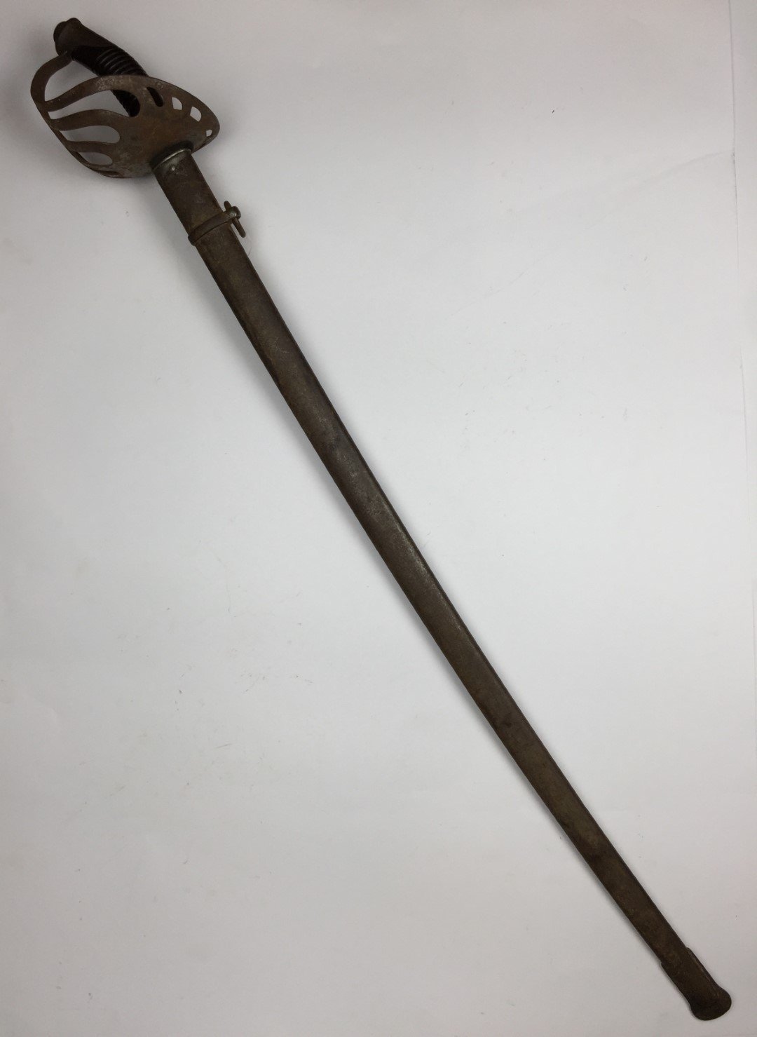 Sable curvo francés tipo Dérué para caballería, fabricado para el ejército de Chile en Châtellerault. Hoja marcada con escudo chileno. Guardamano en hierro calado con siete ramales. Empuñadura en baquelita marrón. Vaina en hierro, con una anilla.