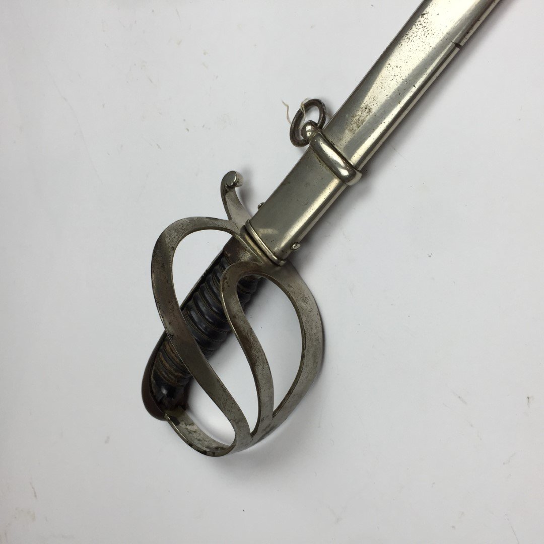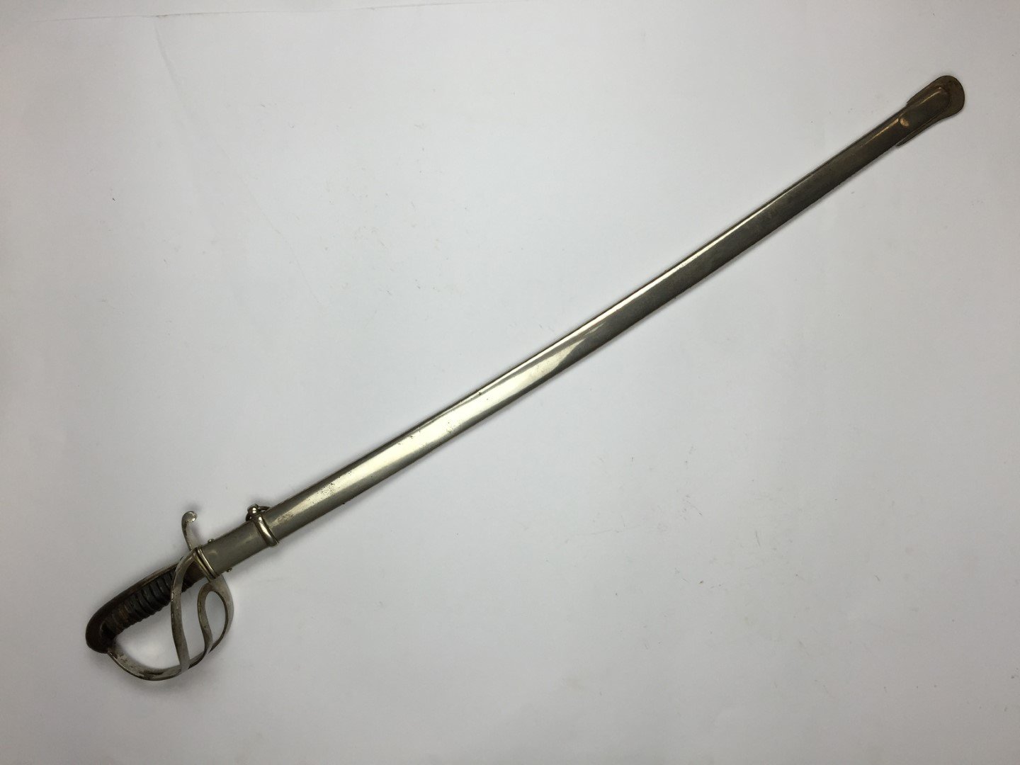 Sable francés curvo modelo 1882. Empuñadura en madera forrada en cuero, averiado. Guardamano en tres ramales en metal niquelado. Vaina en metal niquelado, con una anilla. Tipo de arma utilizada por oficiales del ejército uruguayo a fines del siglo XIX.