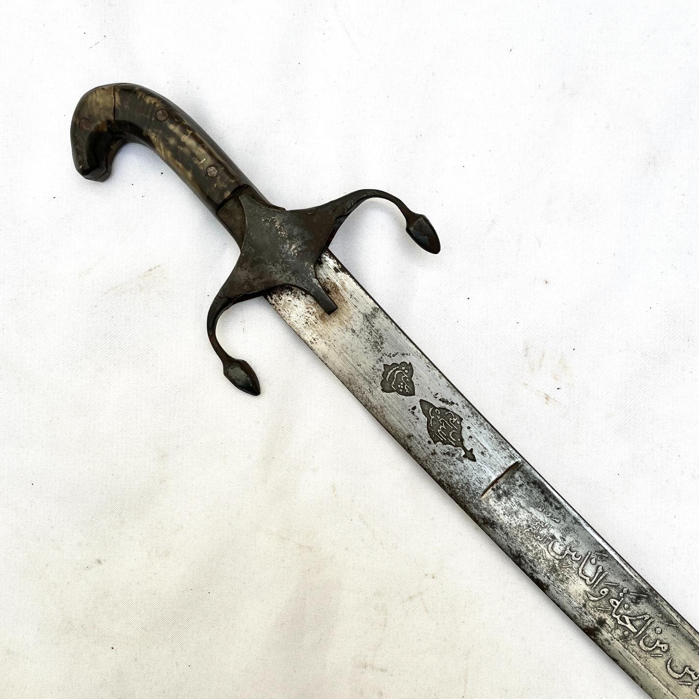 Sable turco otomano tipo Kilij, s. XIX. Hoja grabada al ácido con frases en árabe y punzones del espadero. Empuñadura en hierro forjado con cachas en guampa de búfalo. Vaina en madera forrada en cuero negro, restaurada. Largo 100 cm.