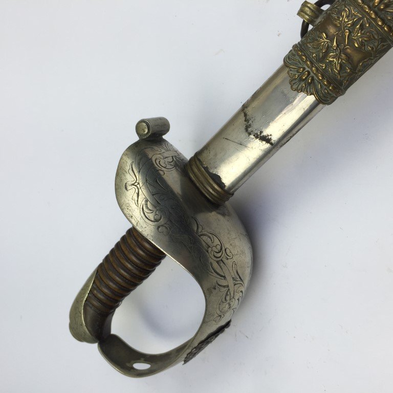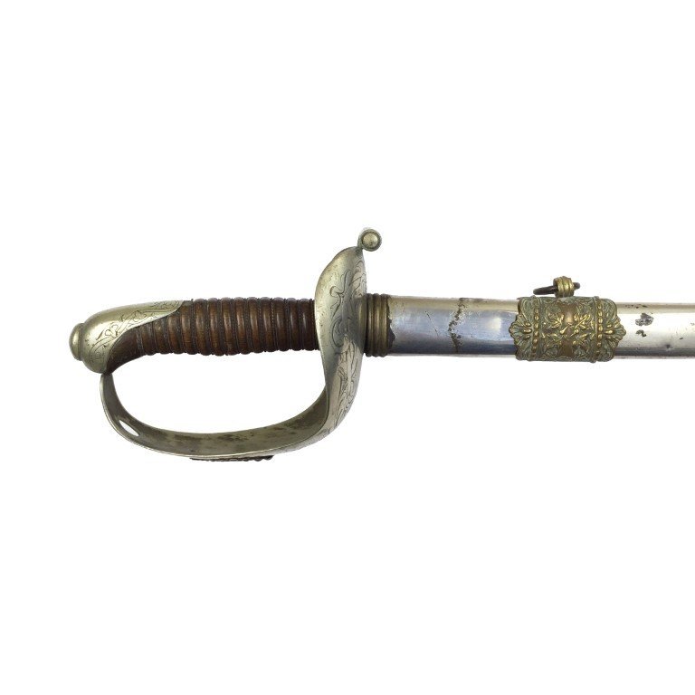 Sable uruguayo. Hoja grabada al ácido «arabescos», «motivos militares», «escudo de armas uruguayo» y cartela con inscripción «Broqua, Scholberg y Cía, Rincón 137 Montevideo», primera dirección de la histórica casa importadora (período 1874-1879, más tarde Rincón 139). Cazoleta en metal niquelado grabado «arabescos» y decorado «escudo de armas uruguayo» aplicado. Empuñadura en guampa con filigrana en bronce. Vaina en metal con restos de niquelado, dos anillas en bronce cinceladas «hojas» y batiente en bronce liso. Largo 103 cm.
