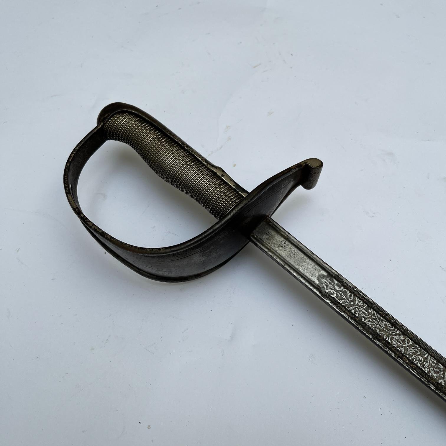 Sable uruguayo de Guardias Nacionales modelo 1870. Guardamanos en acero ornamentado con greca y escudo de armas uruguayo. Empuñadura en torzal de alambre de alpaca. Hoja grabada al ácido con motivos florales y «escudo de armas uruguayo». Punzón «W.R.K., Solingen». Sin vaina.