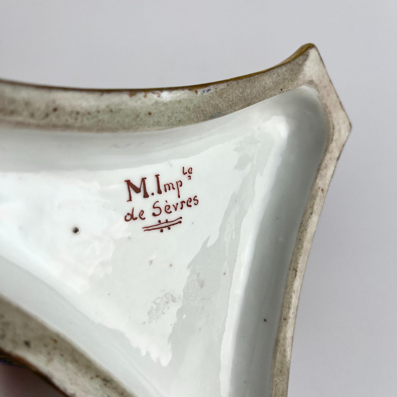 Sahumador francés en porcelana estilo Sèvres época Segundo Imperio decorado a mano «águilas» en oro sobre fondo azul, con tres patas esculturadas «delfines». 20 x 15 cm.