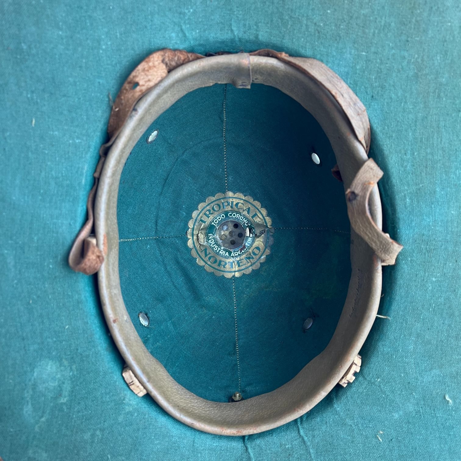 Salacot del ejército uruguayo c. 1940 forrado en paño color caqui con escarapela y escudo en bronce esmaltado.