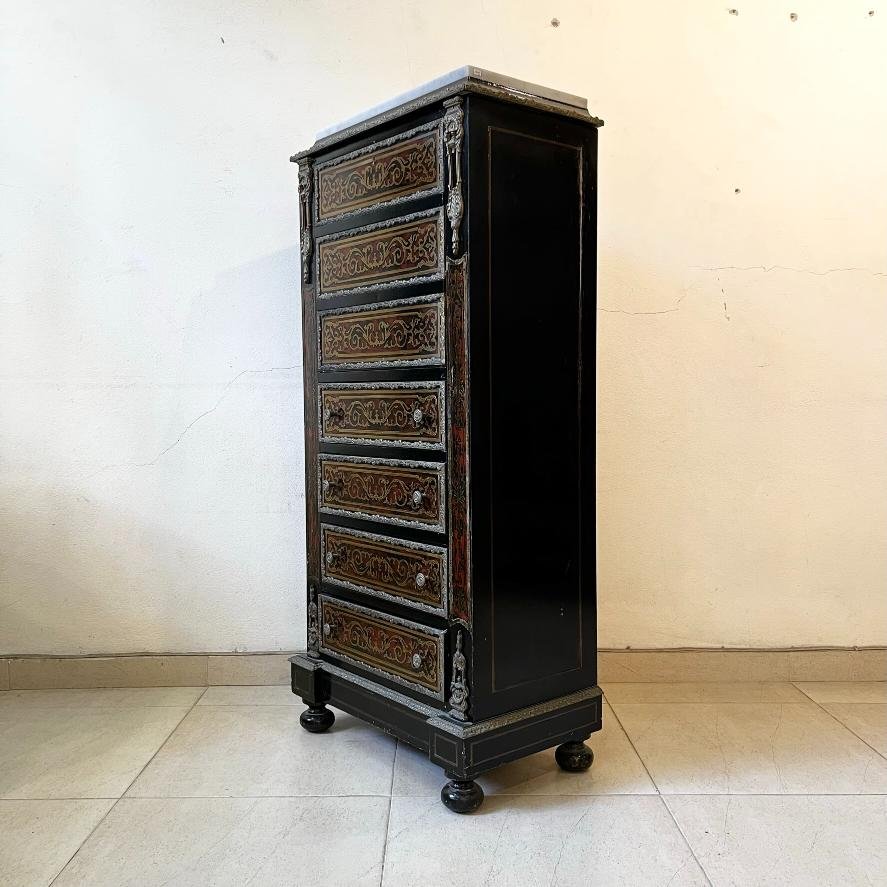 Mesa de sala época Segundo Imperio, en madera ebanizada decorada con marqueterie floral y molduras en bronce cincelado. Rectangular, con cuatro patas con travesaños. 78 x 136 x 76 cm.