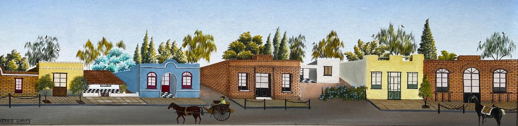 SERGIO GRASS (Escuela argentina, 1936) Óleo sobre tela pegada en fibra «Escena de pueblo» Firmado abajo a la izquierda 18 x 64 cm