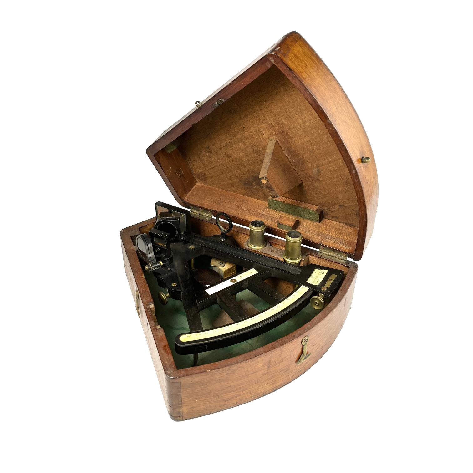 Sextante inglés s. XIX en madera de ébano, marfil y bronce. Presentado en caja de madera original con accesorios.