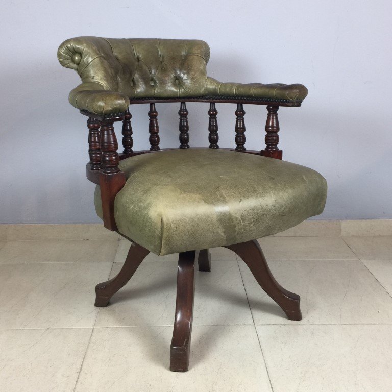 Sillón inglés en caoba. Respaldo con columnas. Asiento, respaldo y apoyabrazos tapizados en cuero capitoneado color verde.