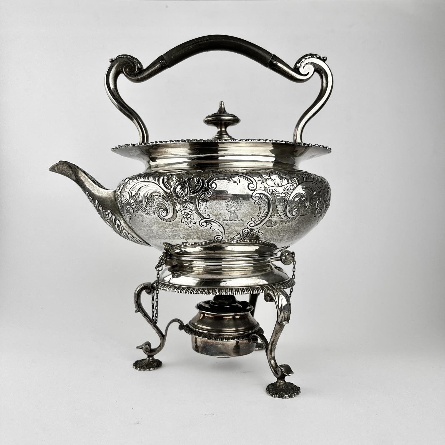 Samovar inglés en plata de Londres año 1906 cincelada «hojas y flores». Tres patas esculturadas y asa en baquelita marrón. Alto 29 cm. Peso 1.600 gr.