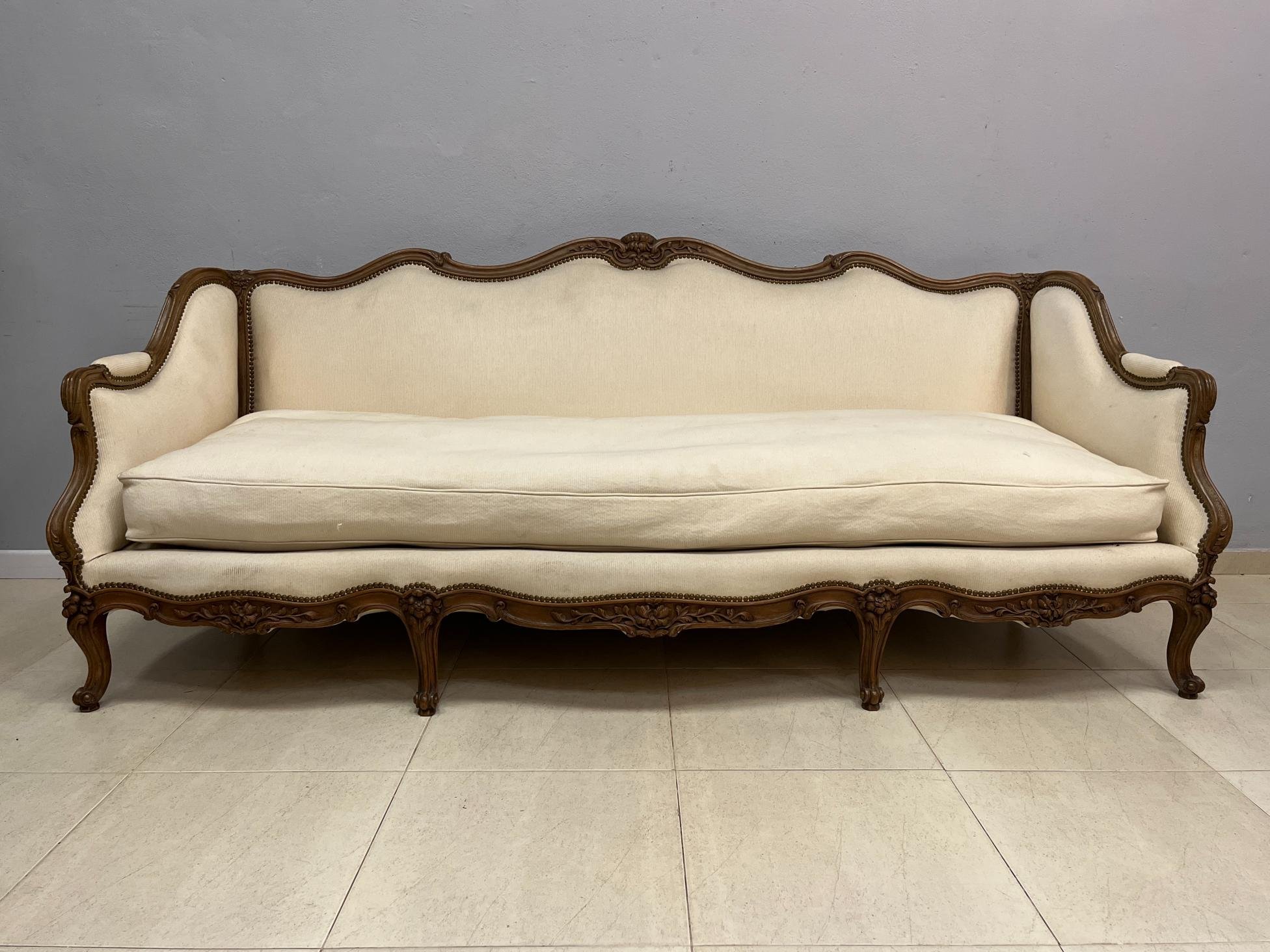 Sofá tres cuerpos estilo Luis XV tapizado en pana blanca, con almohadón en pluma duvet. 90 x 225 x 90 cm.