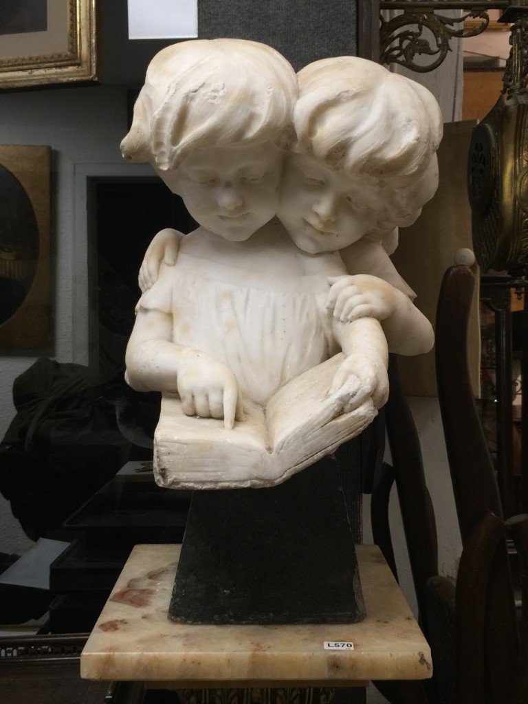 Escultura en alabastro. «La lectura.» 44 x 31 x 39 cm. Con pequeñas averías. Base en granito verde. Alto total 56 cm.