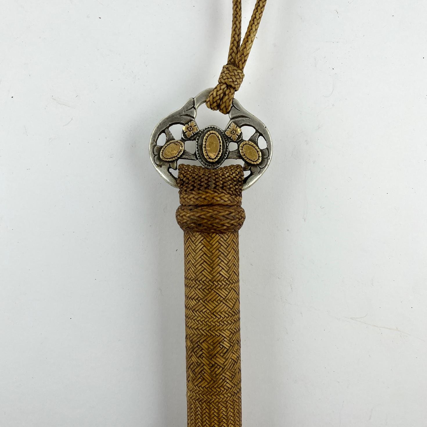Talero de argolla forrado en fino cuero trenzado, con argolla en plata y oro calada y cincelada «hojas y flores».