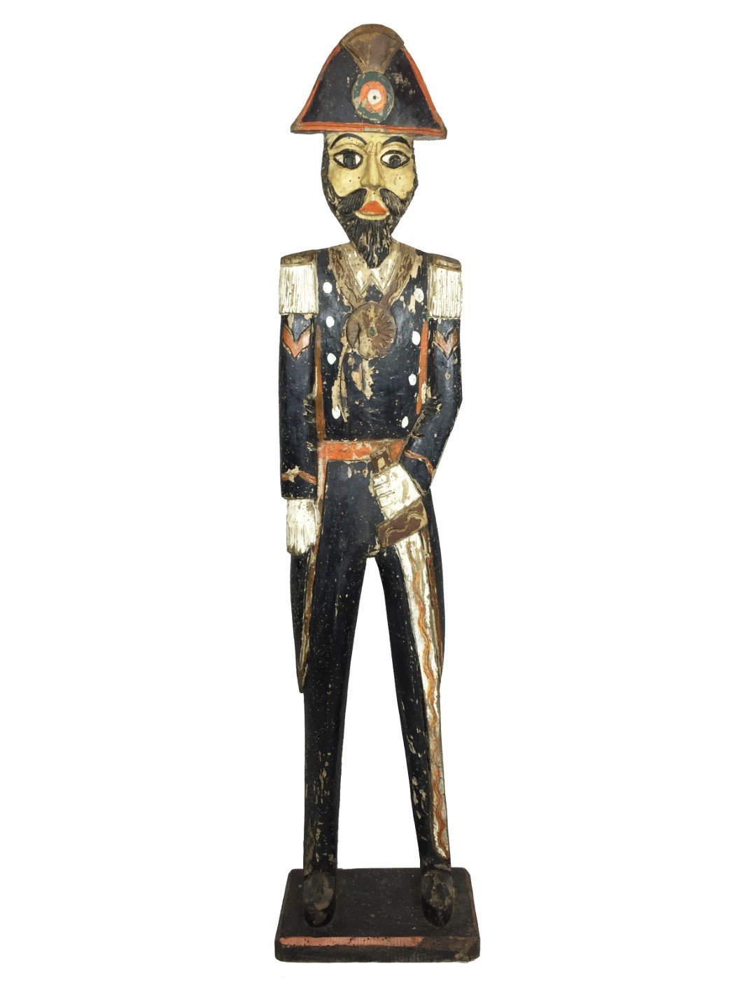 Talla segunda mitad siglo XIX en madera policromada. «Soldado francés de la revolución de 1789.» Alto 138 cm. Con tiros de polilla.