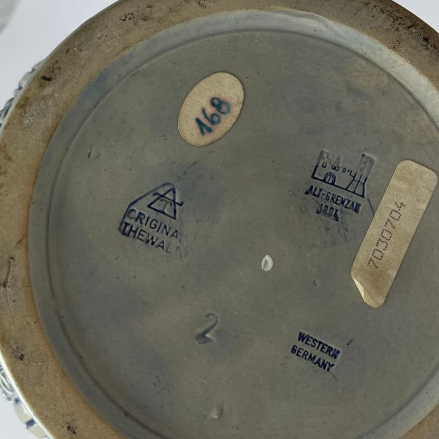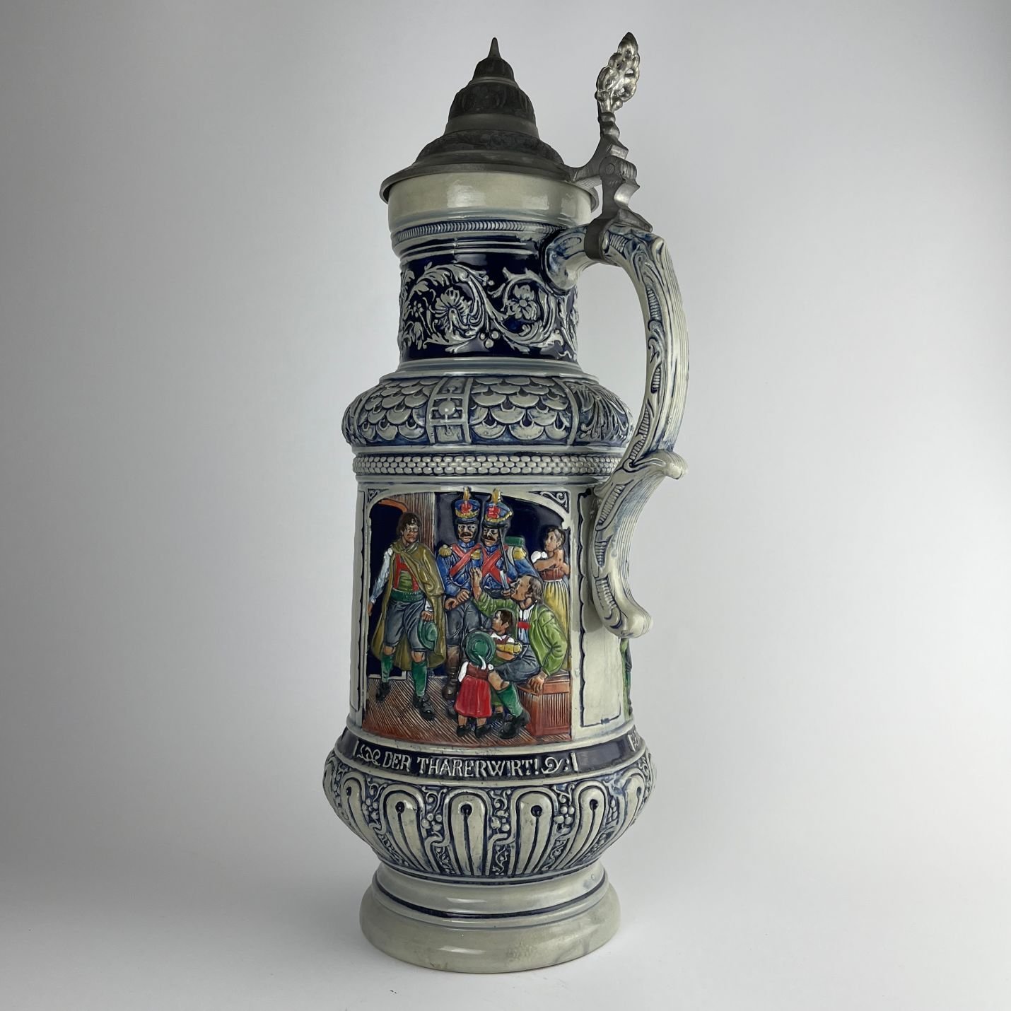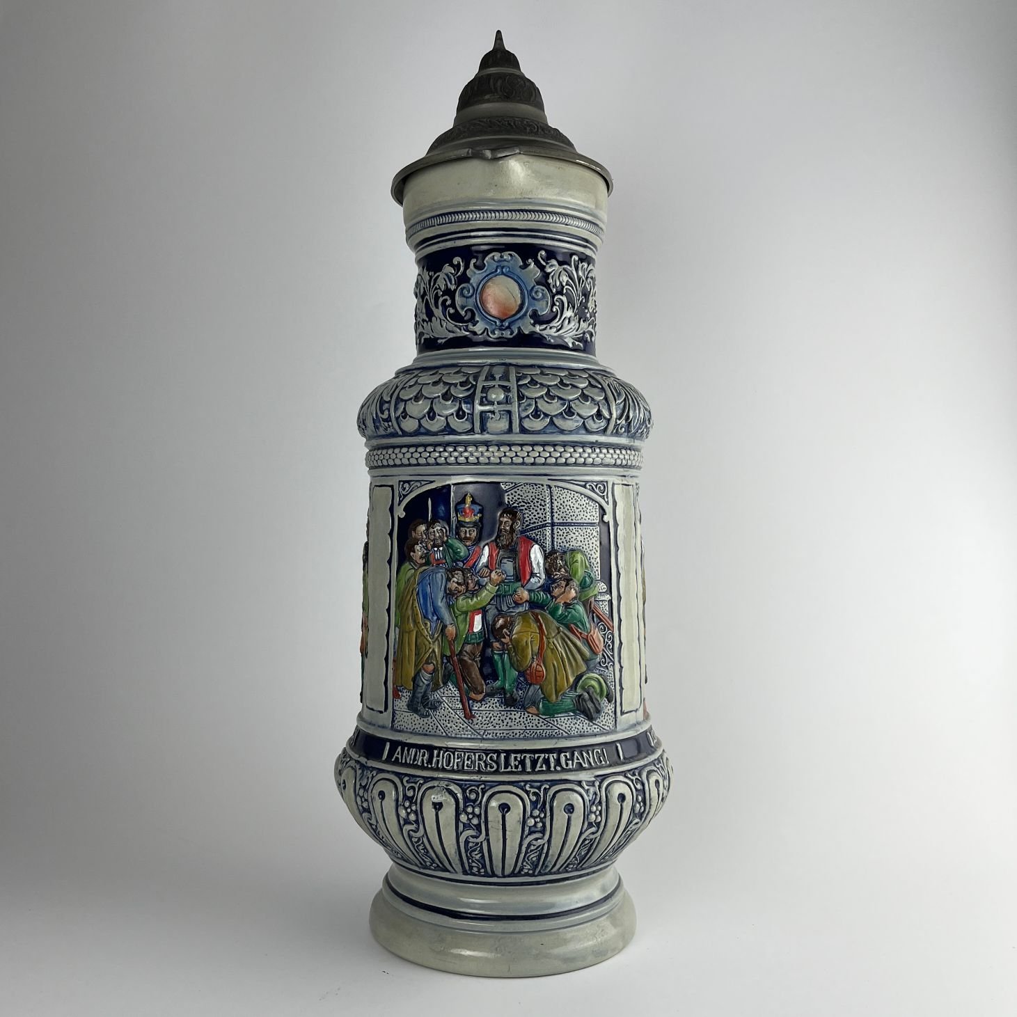 Tankard alemán en gres policromado «escena de pueblo». Tapa en peltre cincelada «hojas». Alto total 44 cm.