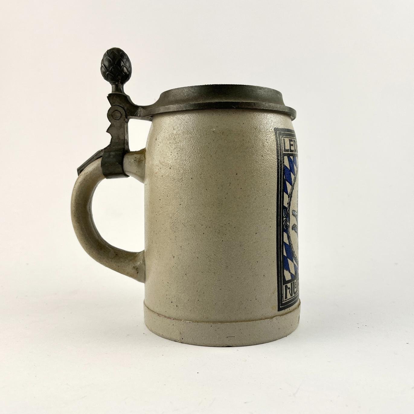 Tankard alemán en gres con tapa en peltre, con inscripción «Leder Brau Nurnberg» e inscripción «Reichsparteitag 1937» grabada en interior de tapa.