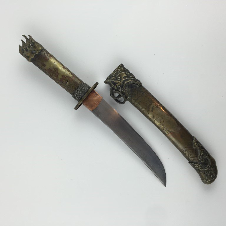 Tanto japonés. Hoja damasquinada. Cabo y vaina en bronce y cobre decorados «escena galante». Largo total 37.5 cm.