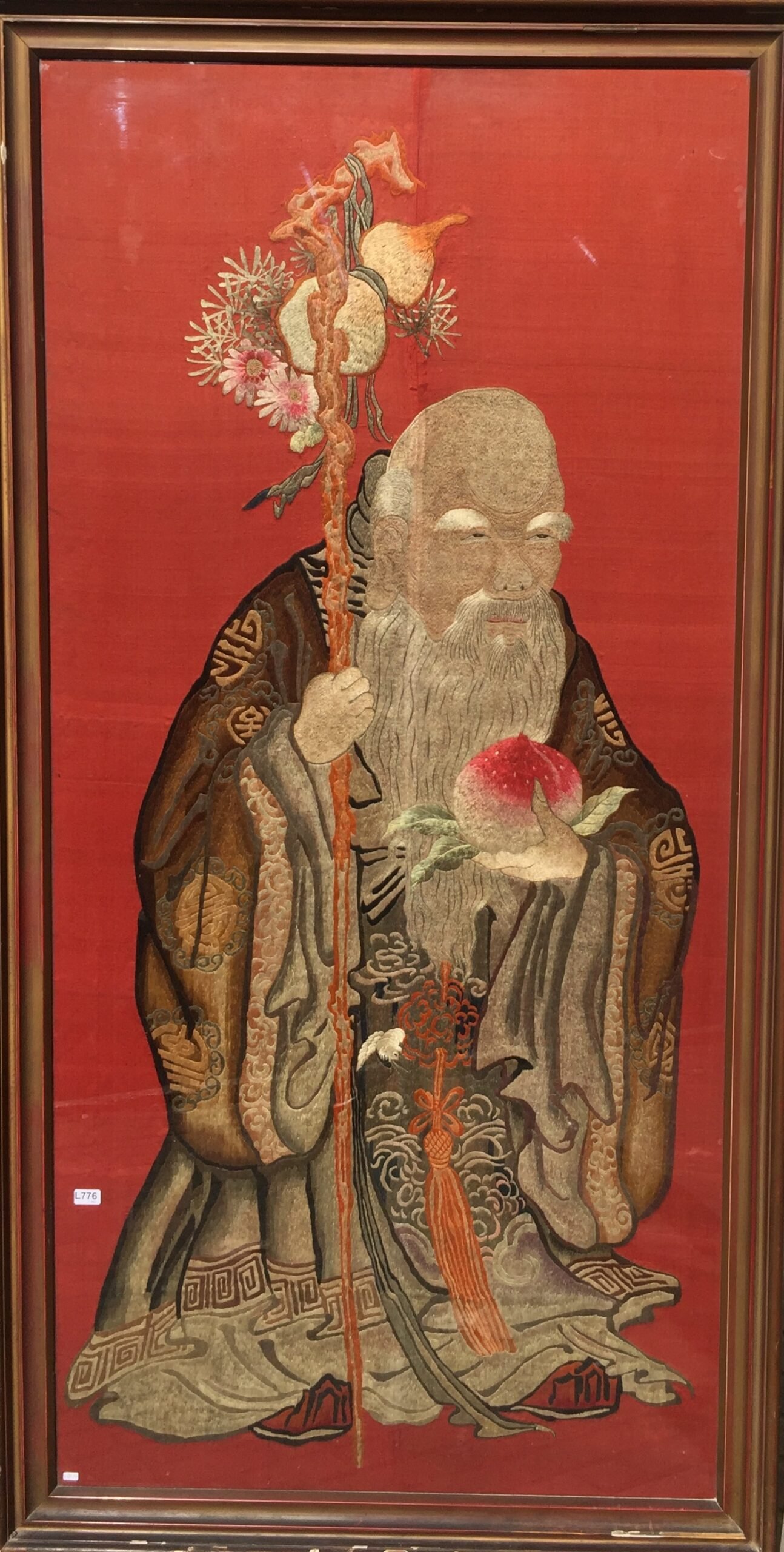 Tapiz chino en seda, bordado con hilos de seda. «Shou», deidad taoísta de la longevidad. 142 x 68 cm.