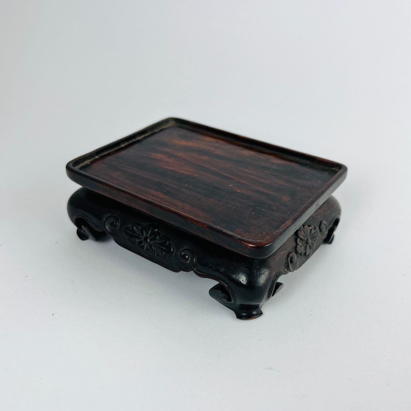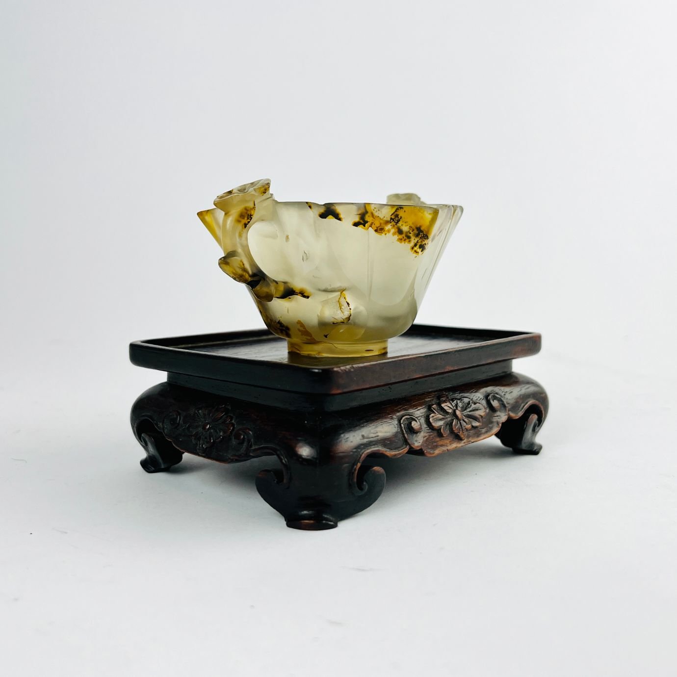 Taza china hexagonal en ágata tallada. Asas esculturadas «flores». 5 x 10 x 7 cm. Base rectangular en madera tallada y calada. Alto total 7.5 cm.