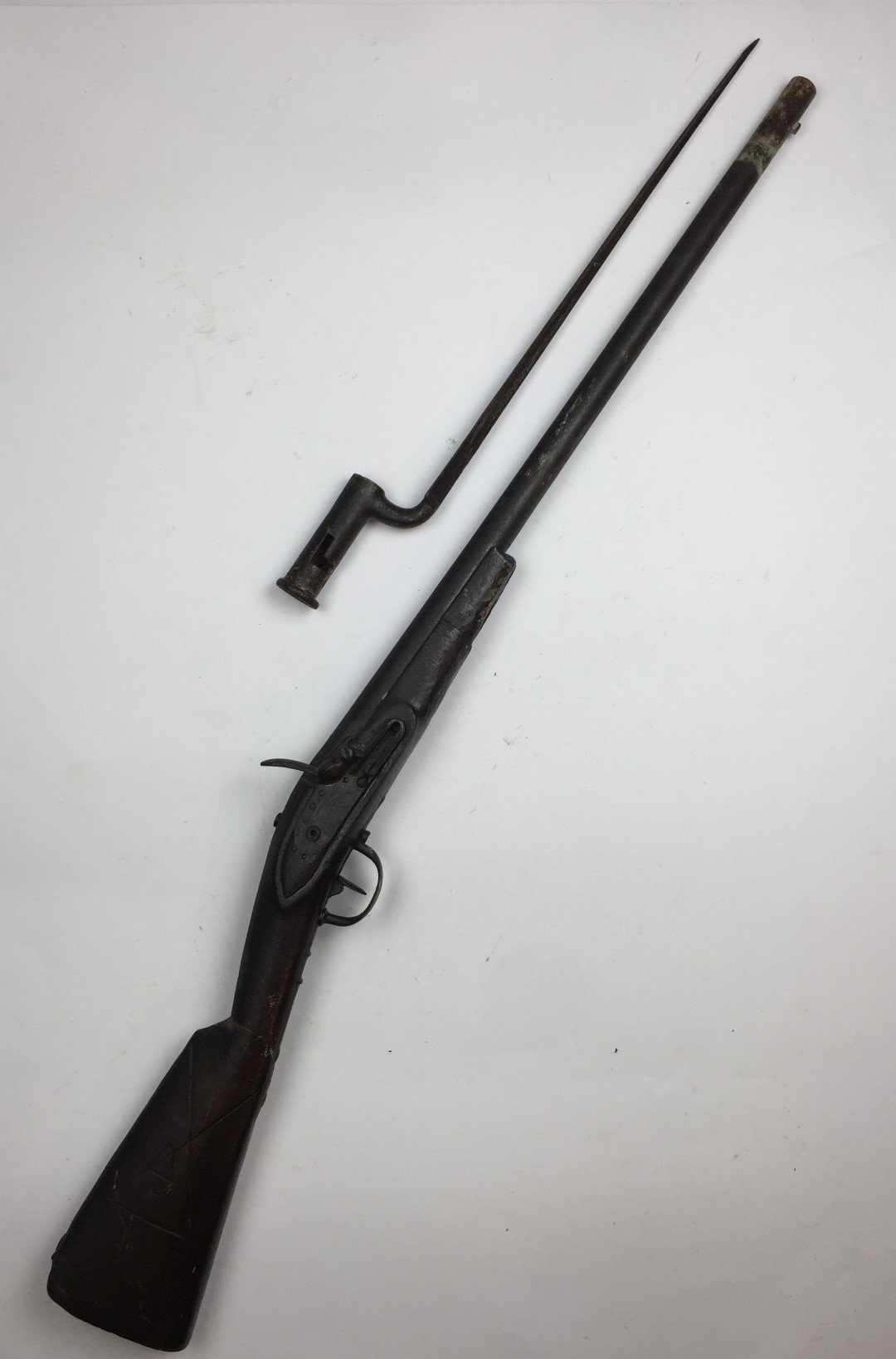 Tercerola de avancarga sistema a pedernal o de chispa. Falta martillo. Guardamonte en bronce. Falta argolla y baqueta. Con bayoneta de cubo original.