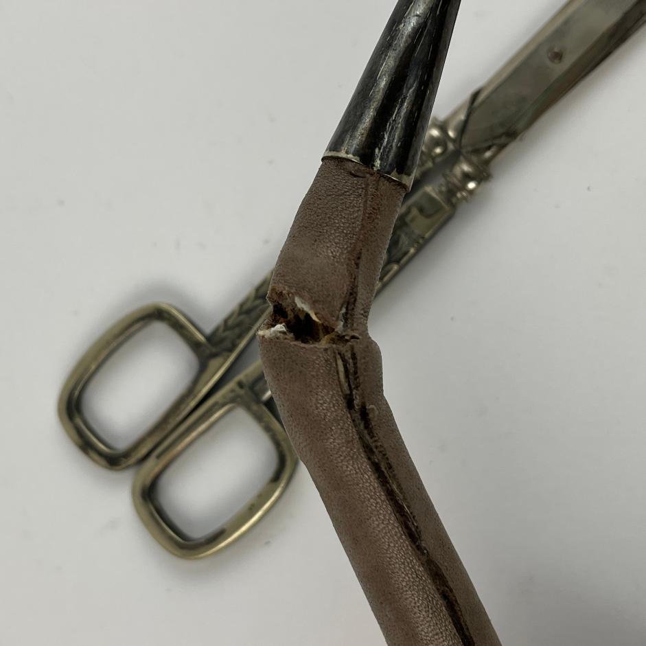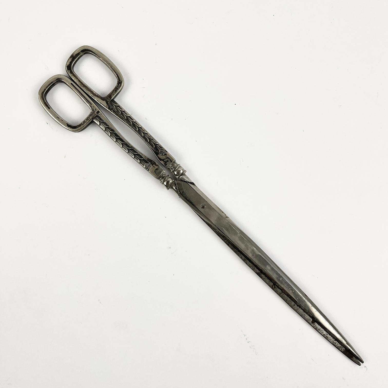 Tijera alemana en metal fabricada por WMF, decorada «espigas». Largo 27 cm. Vaina forrada en cuero con puntera en metal liso. Cuero no original.