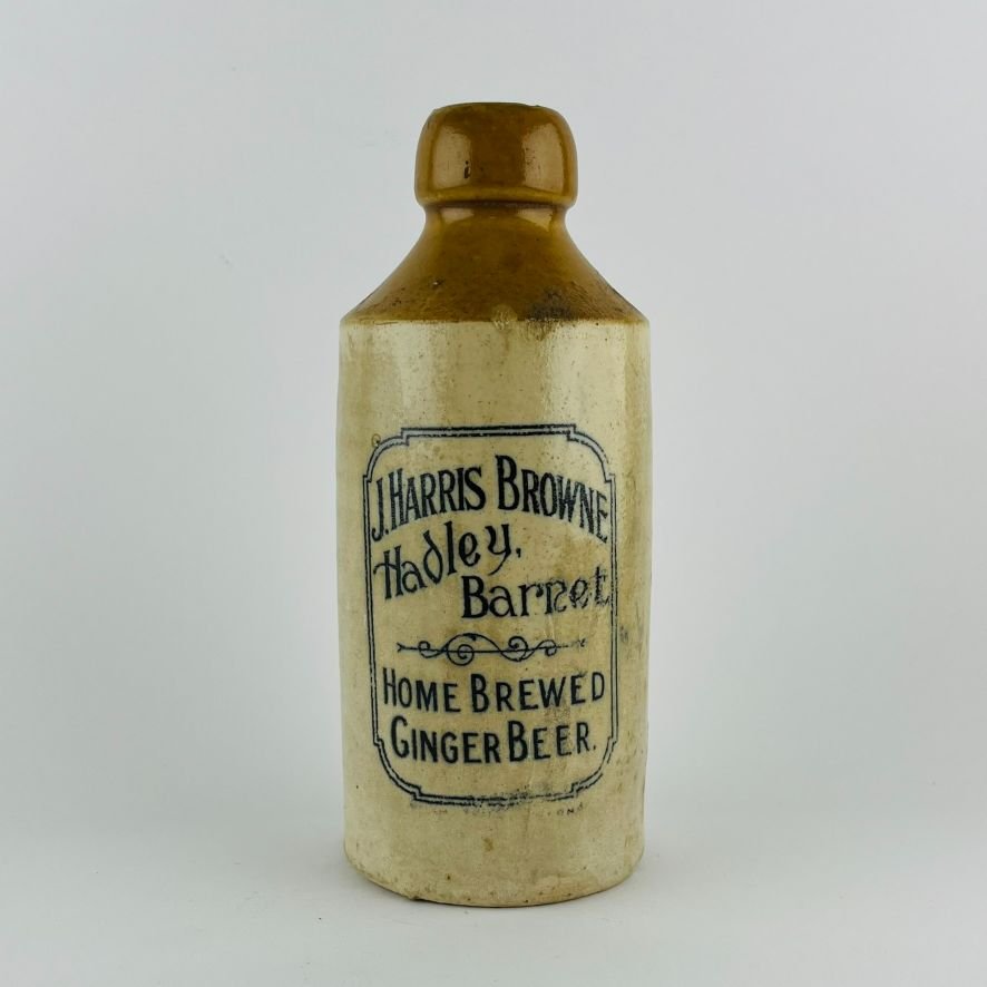 «J. Harris Browne. Hadley, Barnet. Home Brewed Ginger Beer.” En dos tonos. Marca estampada en negro. Sello inciso del fabricante.