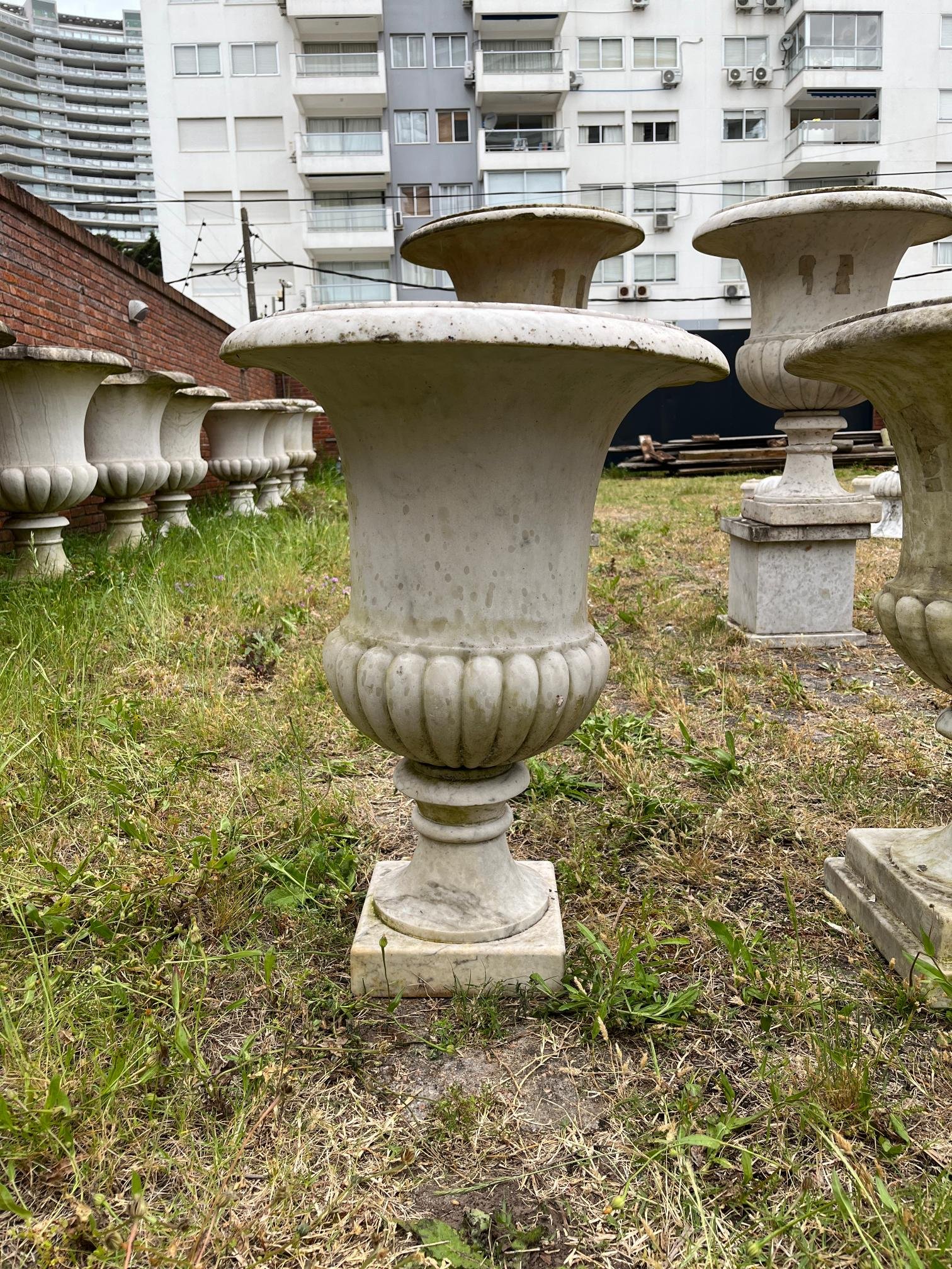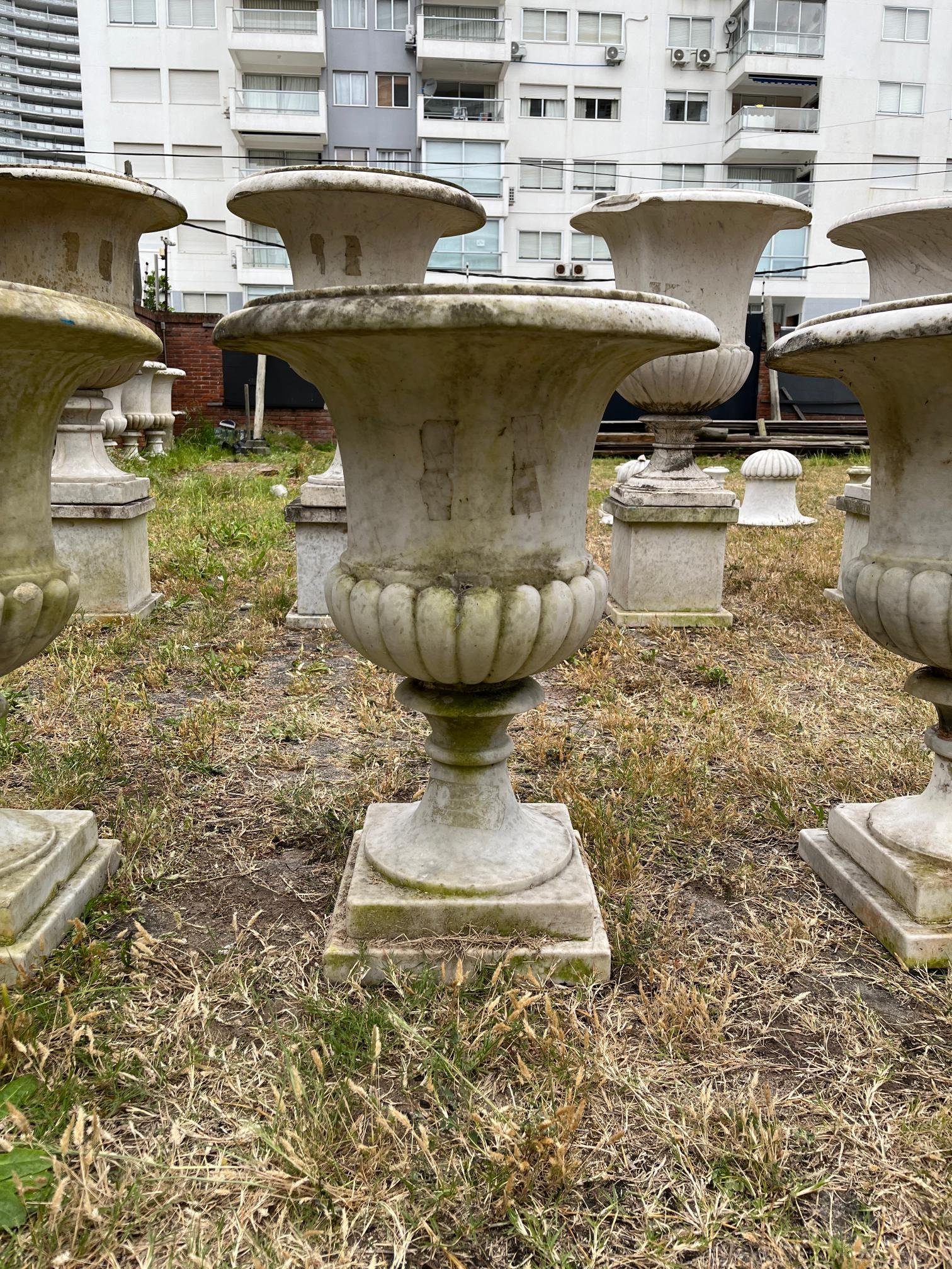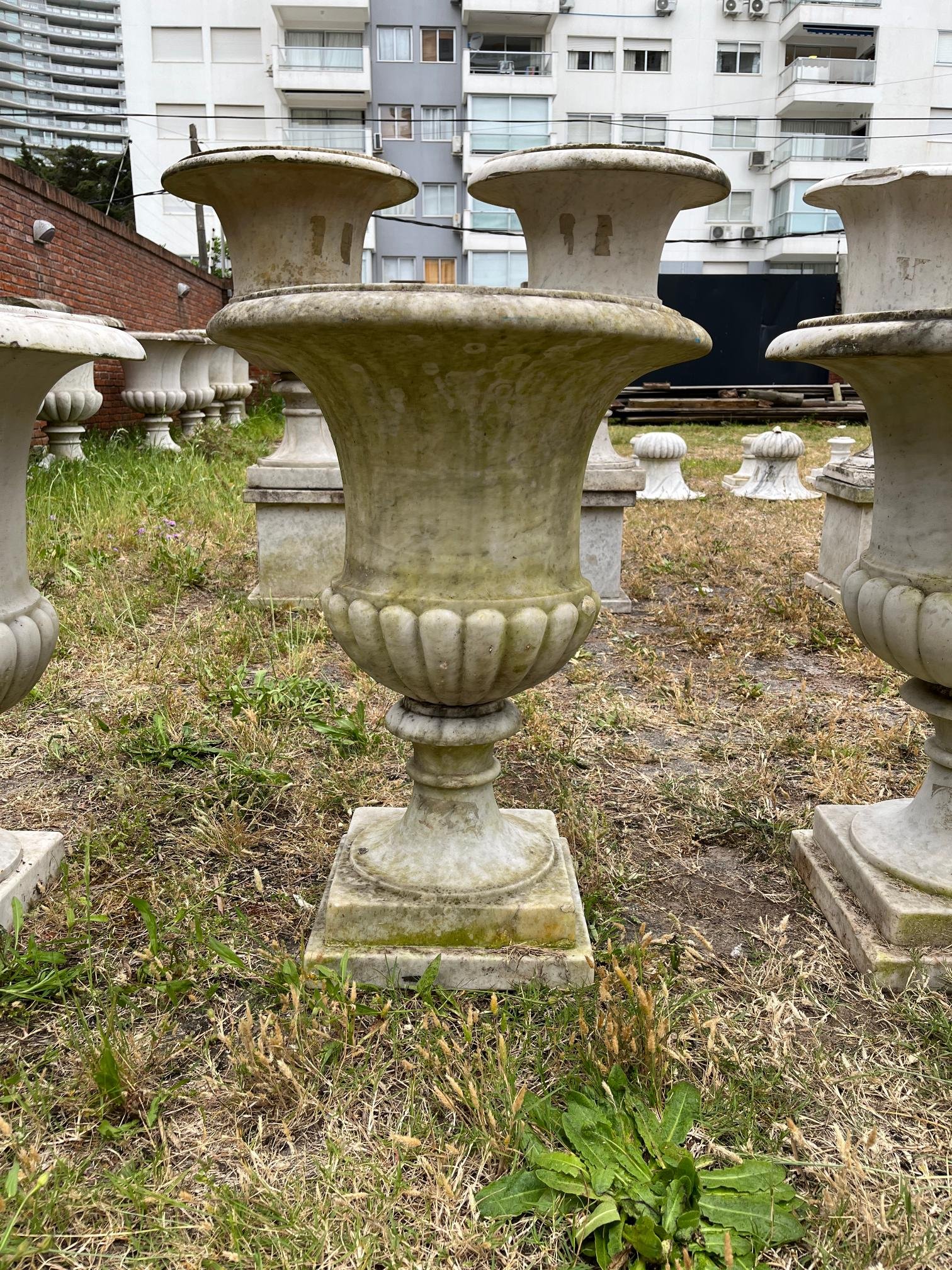 Tres copones en mármol blanco veteado con friso lobulado. 68 x 50 cm.