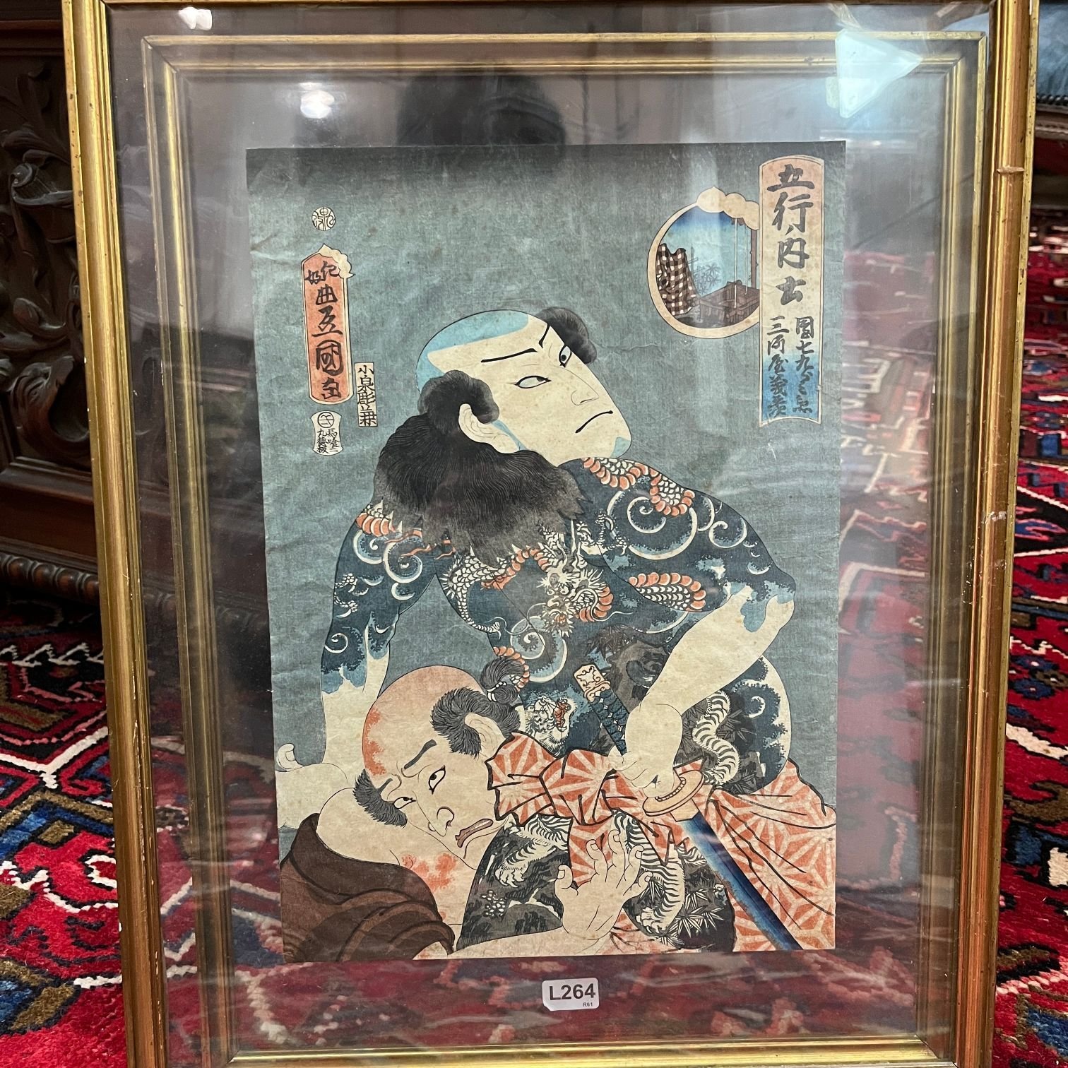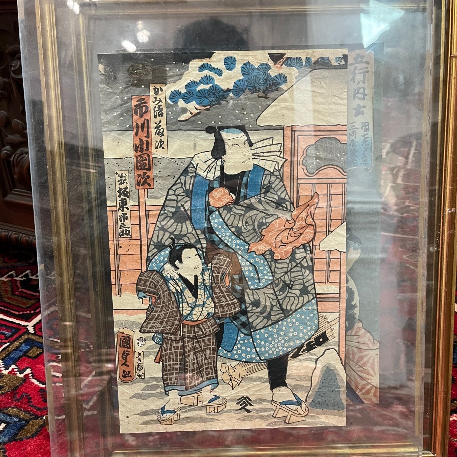 Tres estampas japonesas sobre papel. «Personajes.» 35 x 25 cm, 36 x 22 cm y 23 x 35 cm. Impresas en período Meji. Presentan manchas de humedad.