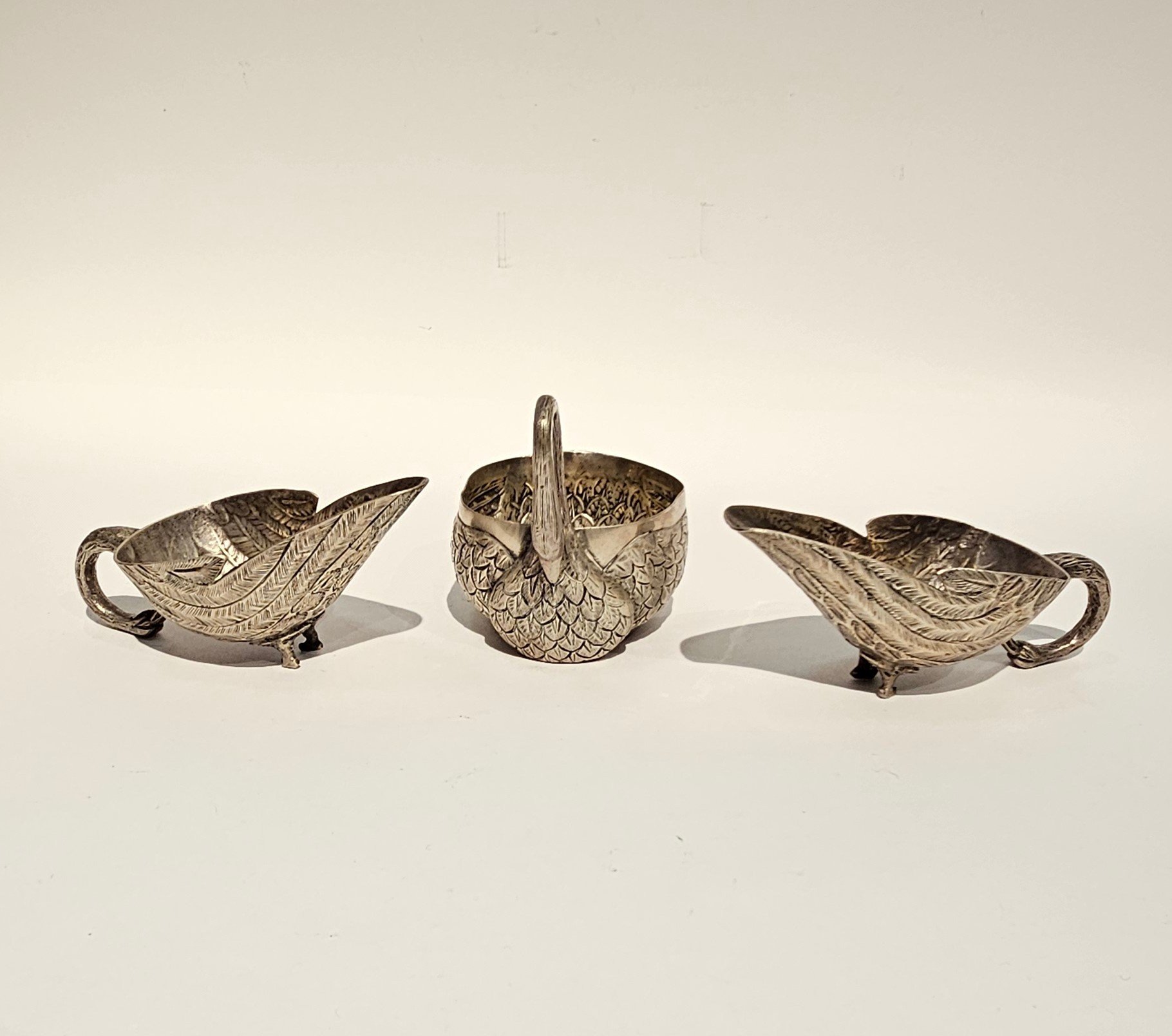 Tres pequeñas salseras en plata mexicana esculturadas «cisnes». Peso total 370 gr.