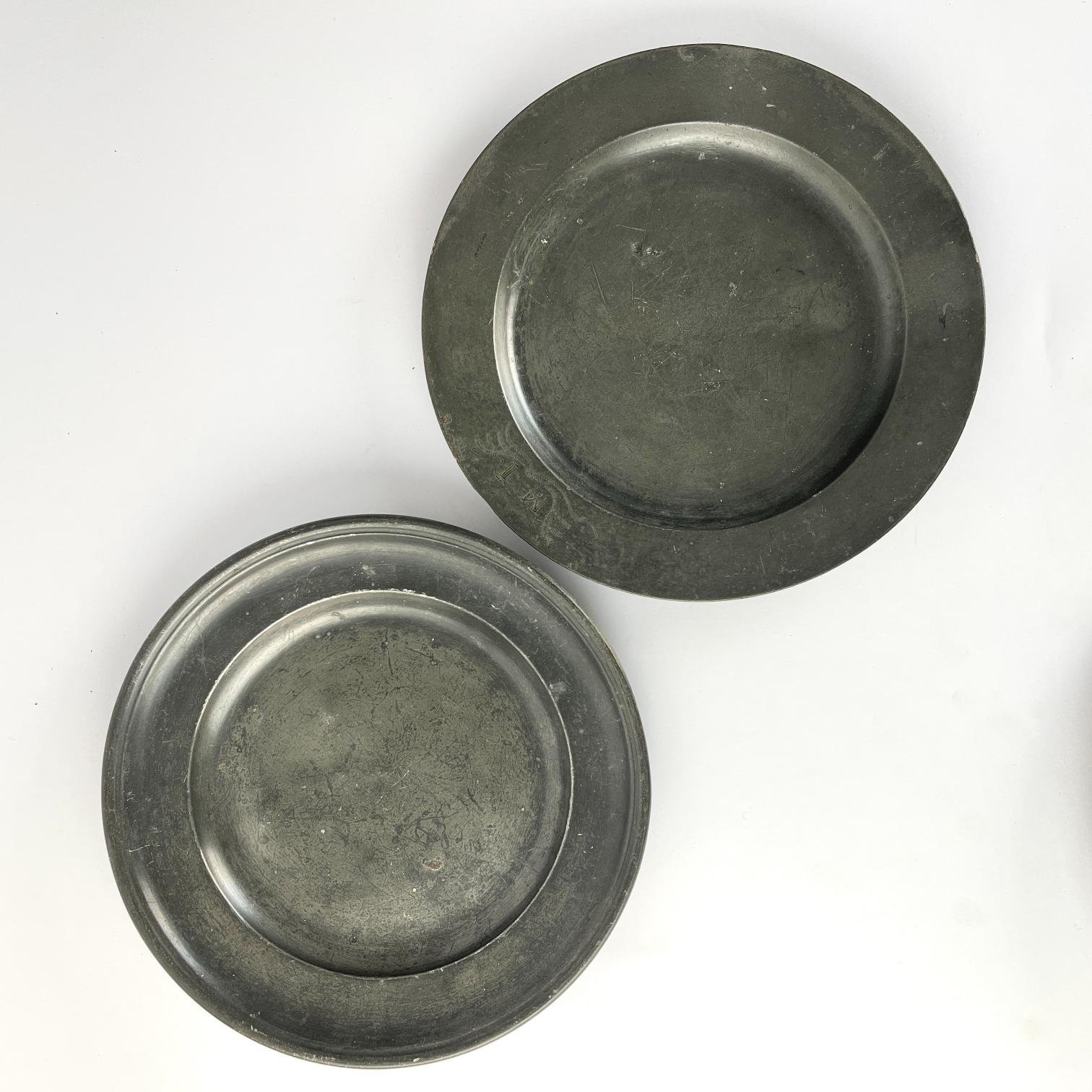 Tres platos de peltre, s. XIX, diferentes. Diámetros 22, 22,5 y 30 cm.