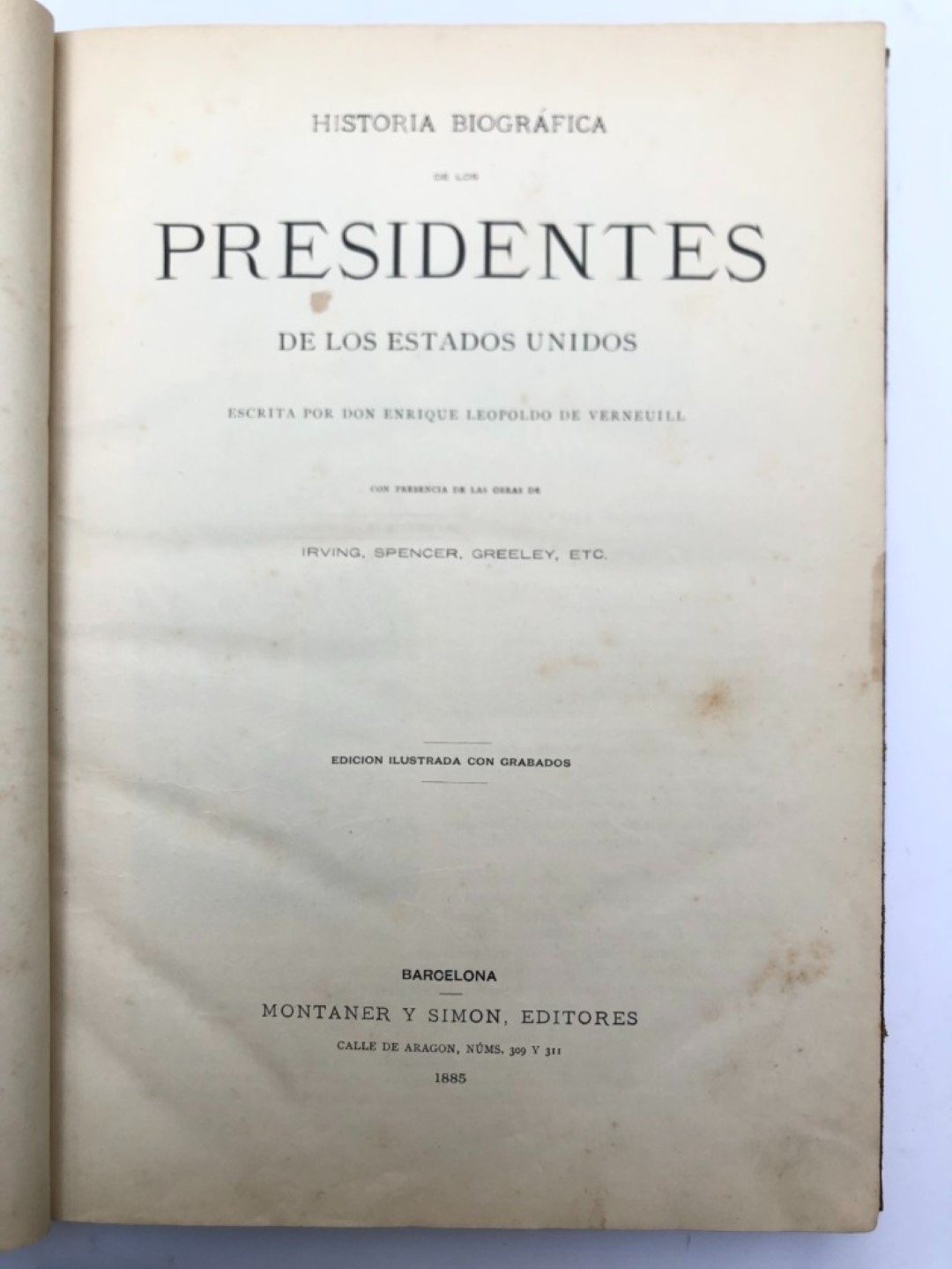 VERNEUILL, Enrique Leopoldo: Historia biográfica de los Presidentes de los Estados Unidos. Edición ilustrada con grabados. Barcelona, Montaner y Simón editores. 1885. Encuadernación en tapa dura. Con averías.
