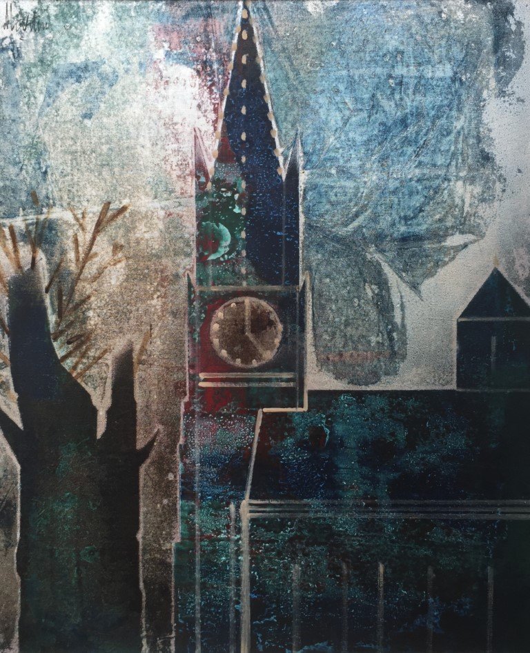 MARTÍN, Vicente (escuela uruguaya, 1911-1988). Acrílico sobre tela. “Paisaje con iglesia.” Firmado arriba a la izquierda. 72 x 60 cm.