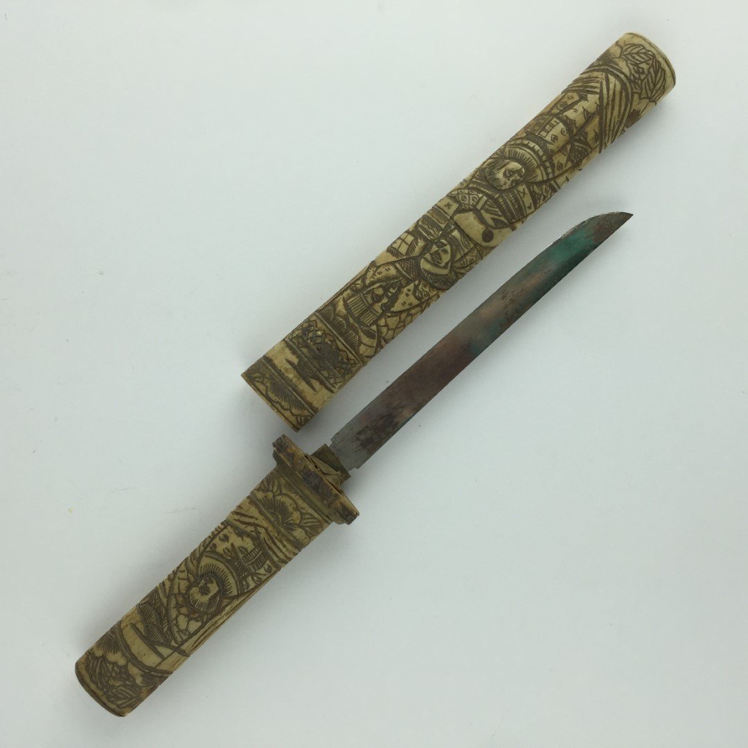 Wakisahi con cabo y vaina en hueso totalmente tallado «personajes». Pequeñas averías. Largo total 33 cm.