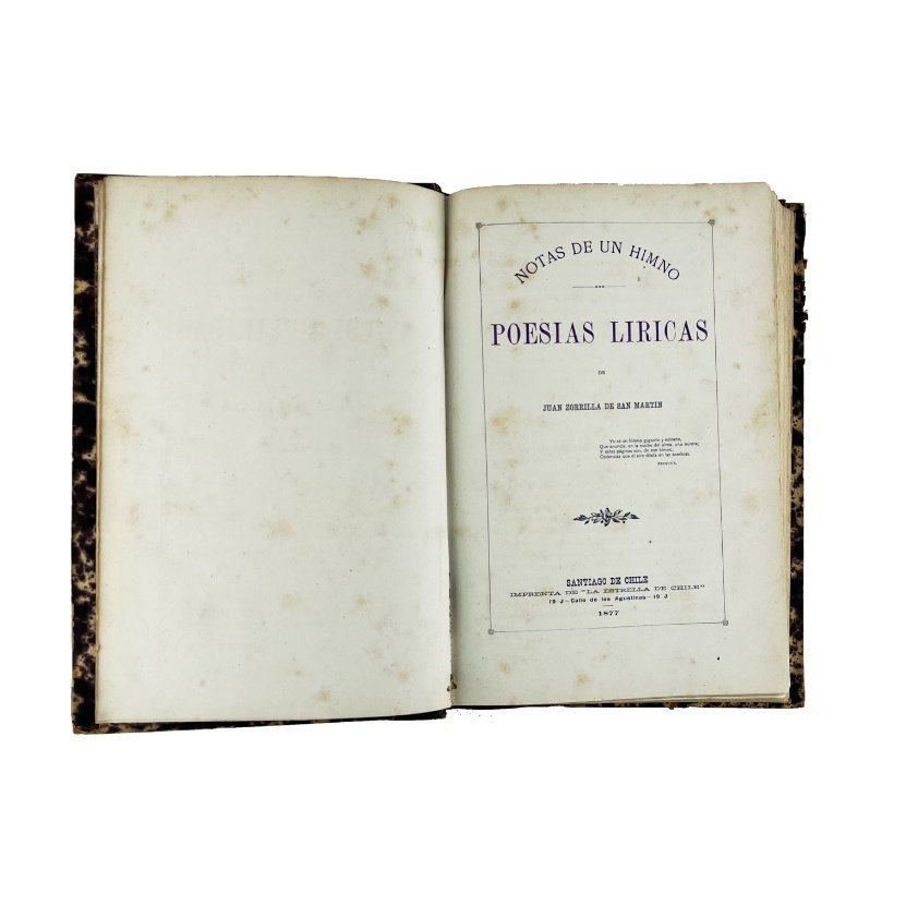 ZORRILLA DE SAN MARTÍN, JUAN. “Poesías Líricas. Notas de un himno”. Santiago de Chile, 1877.
